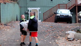When we got home from the school, Brett had a large box of samples waiting by the mailbox. UPS here is quite annoying. If it's a small box, they drive it up and leave it by the door. If it's a large box, they leave it by the mailbox. What sense does that make?! FedEx leaves everything by the door! Luckily we have strong boys who like to help. Talan carried the box and Easton tried to push him up the driveway. 😂